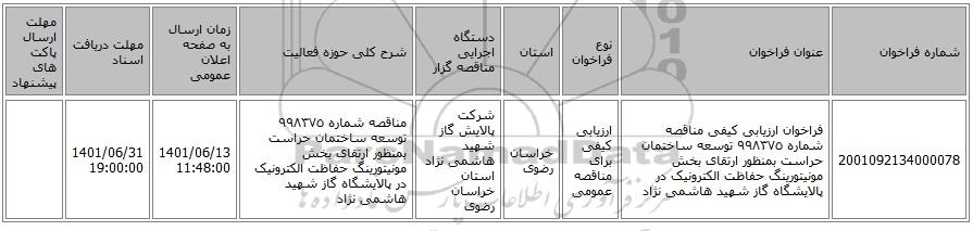 مناقصه، فراخوان ارزیابی کیفی مناقصه شماره ٩٩٨٣٧٥ توسعه ساختمان حراست بمنظور ارتقای بخش مونیتورینگ حفاظت الکترونیک در پالایشگاه گاز شهید هاشمی نژاد, مناقصه، فراخوان ارزیابی کیفی مناقصه شماره ٩٩٨٣٧٥ توسعه ساختمان حراست بمنظور ارتقای بخش مونیتورینگ حفاظت الکترونیک در پالایشگاه گاز شهید هاشمی نژاد