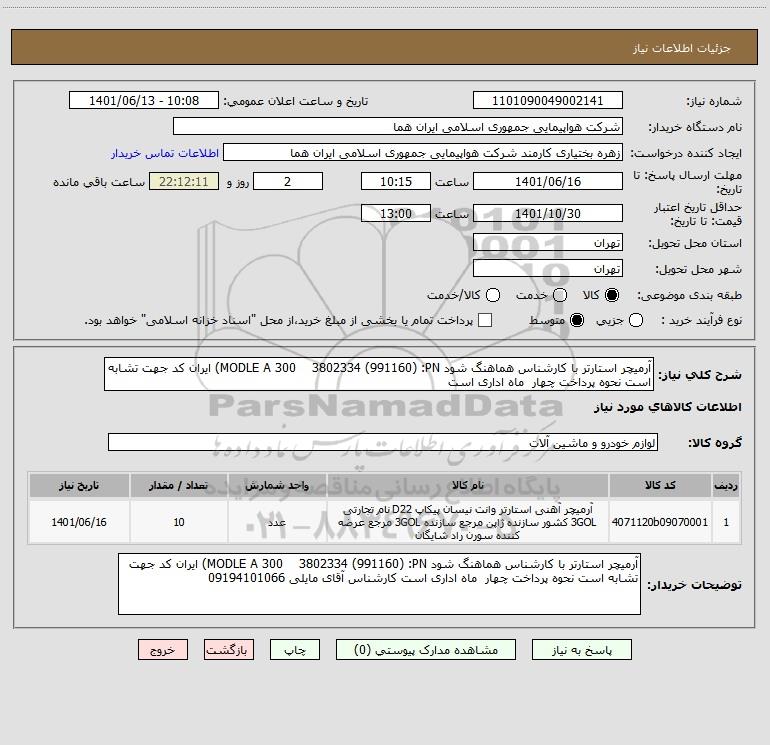 شرح کلی نیاز: آرمیچر استارتر با کارشناس هماهنگ شود MODLE A 300 3802334 (991160) :PN) ایران کد جهت تشابه است نحوه پرداخت چهار ماه اداری است