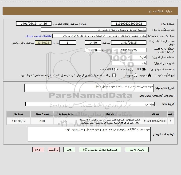 شرح کلی نیاز: خرید چمن مصنوعی و نصب ان و هزینه حمل و نقل