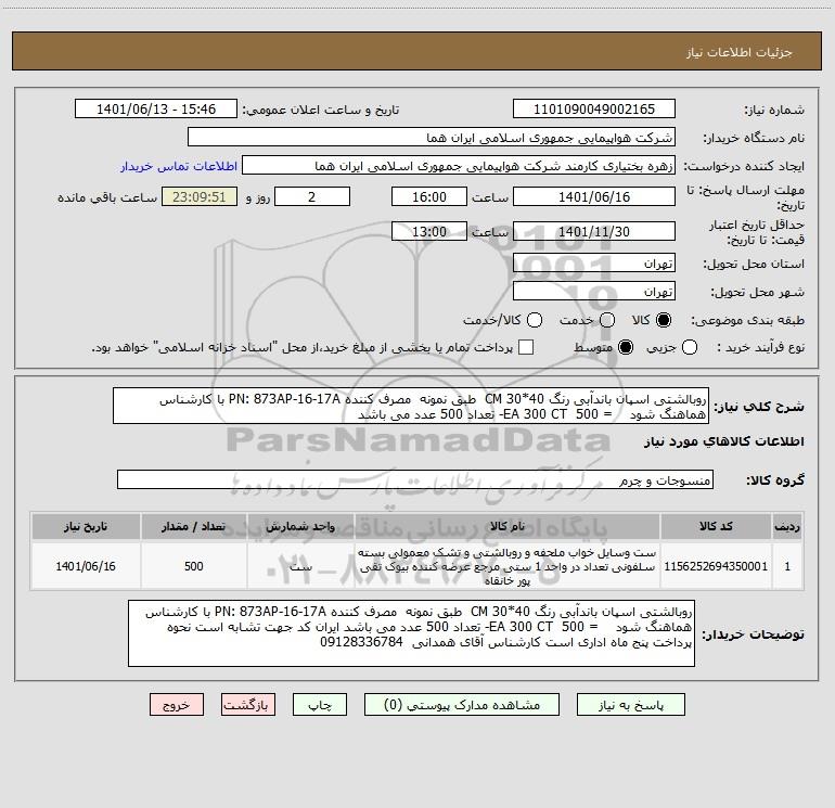 شرح کلی نیاز: روبالشتی اسپان باندآبی رنگ 40*30 CM طبق نمونه مصرف کننده PN: 873AP-16-17A با کارشناس هماهنگ شود = 500 EA 300 CT- تعداد 500 عدد می باشد