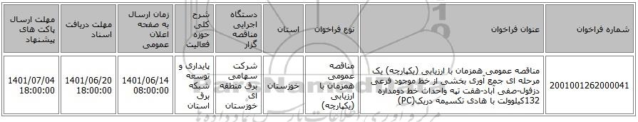 | 2001001262000041 | مناقصه عمومی همزمان با ارزیابی (یکپارچه) یک مرحله ای جمع آوری بخشی از خط موجود فرعی دزفول-صفی آباد-هفت تپه واحداث خط دومداره 132کیلوولت با هادی تکسیمه دریک(PC) | مناقصه عمومی همزمان با ارزیابی (یکپارچه) | خوزستان | شرکت سهامی برق منطقه ای خوزستان | پایداری و توسعه شبکه برق استان | 1401/06/14 08:00:00 | 1401/06/20 18:00:00 | 1401/07/04 18:00:00 |