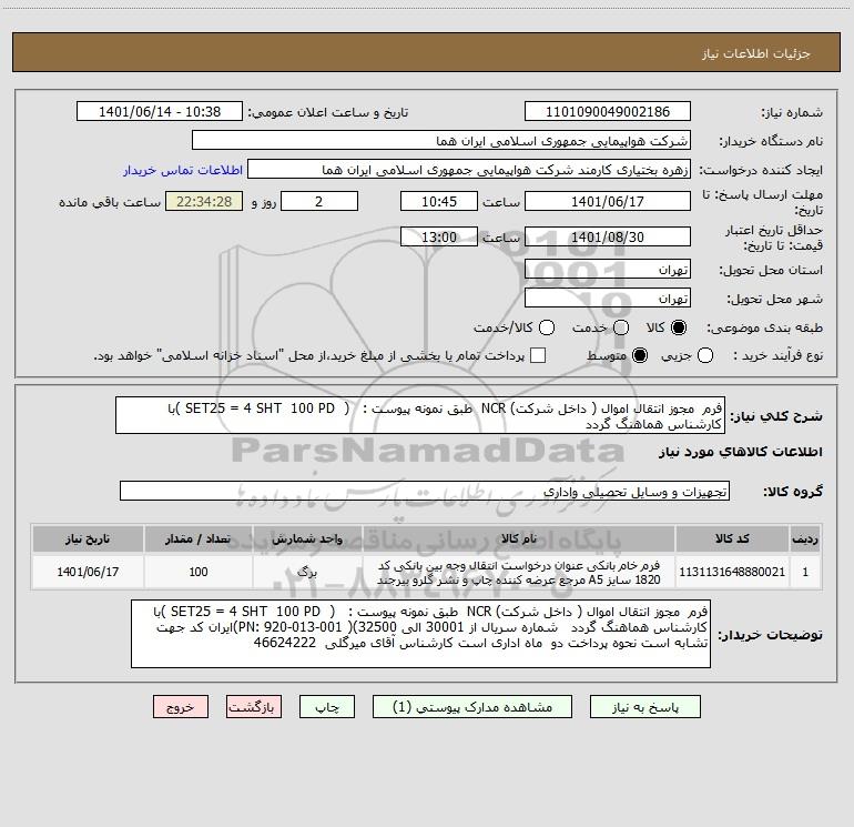 شرح کلی نیاز: فرم مجوز انتقال اموال ( داخل شرکت) NCR طبق نمونه پیوست : ( SET25 = 4 SHT 100 PD )با کارشناس هماهنگ گردد