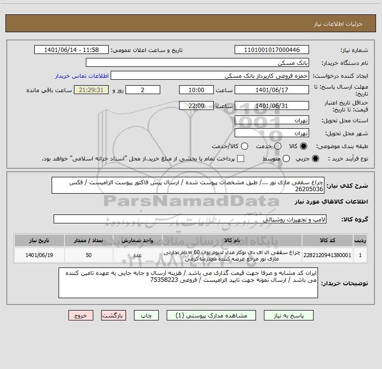 شرح کلی نیاز: چراغ سقفی مازی نور .../ طبق مشخصات پیوست شده / ارسال پیش فاکتور پیوست الزامیست / فکس 26205036