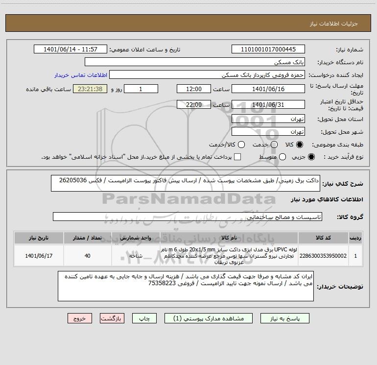 شرح کلی نیاز: داکت برق زمینی/ طبق مشخصات پیوست شده / ارسال پیش فاکتور پیوست الزامیست / فکس 26205036