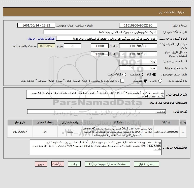 شرح کلی نیاز: توپ تنیس خاکی ( طبق نمونه ) با کارشناس هماهنگ شود. ایران کد انتخاب شده صرفا جهت تشابه می باشد. تعداد 24 بسته