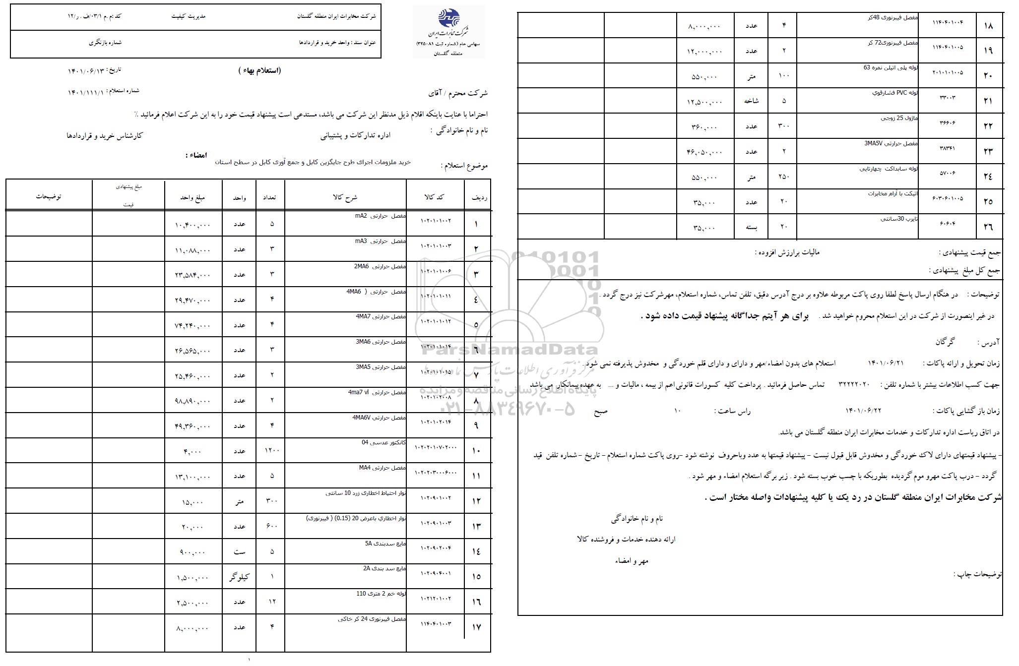 احتراما با عنایت به اینکه اقلام ذیل مدنظر این شرکت می باشد مستدعی است پیشنهاد قیمت خود را به این شرکت اعلام فرمایید