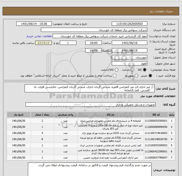 استعلام میز اداری ال، میز کنفرانس 8نفره، صندلی گردان اداری، صندلی گردان کنفرانس، جالباسی فلزی، جا کفشی، کمد کتابخانه (مطابق مشخصات فنی پیوست), استعلام میز اداری ال، میز کنفرانس 8نفره، صندلی گردان اداری، صندلی گردان کنفرانس، جالباسی فلزی، جا کفشی، کمد کتابخانه (مطابق مشخصات فنی پیوست)