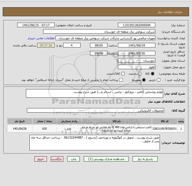 شرح کلی نیاز: لوازم روشنایی (لامپ ، پروژکتور ، ترانس ، استاتر و...) طبق شرح پیوست
