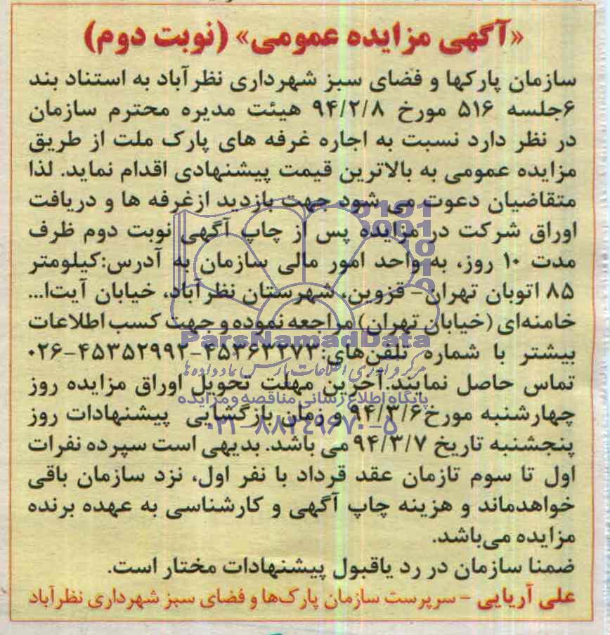 سازمان پارک ها و فضای سبز شهرداری نظرآباد به استناد بند 6 جلسه 516 مورخ 94.2.8 هیئت مدیره محترم سازمان در نظر دارد نسبت به اجاره غرفه های پارک ملت از طریق مزایده عمومی به بالاترین قیمت پیشنهادی اقدام نماید . لذا از متقاضیان دعوت می شود جهت بازدید و دریافت اوراق شرکت در مزایده و کسب اطلاعات بیشتر پس از چاپ آگهی نوبت دوم ظرف مدت 10 روز به واحد امور مالی سازمان به آدرس کیلومتر 85 اتوبان تهران قزوین شهرستان نظرآباد خیابان آیت اله خامنه ای ( خیابان تهران ) مراجعه نموده و جهت کسب اطلاعات بیشتر با شماره تلفن های 45352992 و 45363273 -026 تماس حاصل نمایند آخرین مهلت تحویل اوراق مزایده روز چهارشنبه مورخ 94.3.6 و زمان بازگشایی پیشنهادات روز پنجشنبه تاریخ 94.3.7 می باشد. بدیهی است سپرده نفنرات اول تاسوم تا زمان عقد قرارداد با نفر اول نزد سازمان باقی خواهد ماند و هزینه چاپ آگهی و کارشناس به عهده برنده مزایده می باشد در ضمن سازمان در رد کلیه و یا قبول هر یک از پیشنهادات مختار است.