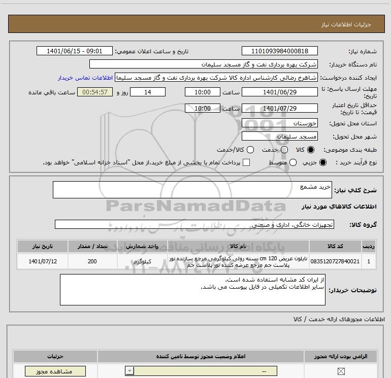 نام دستگاه خریدار:شرکت بهره برداری نفت و گاز مسجد سلیمان