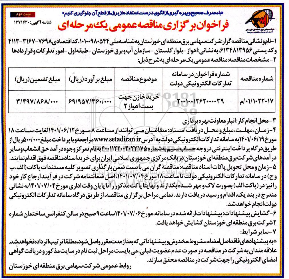 | 1022017/ 00 / م | 2001001262000039 | خرید خازن جهت پست اهواز 2 | 69.957.360.000 | 3.497.868.000 |