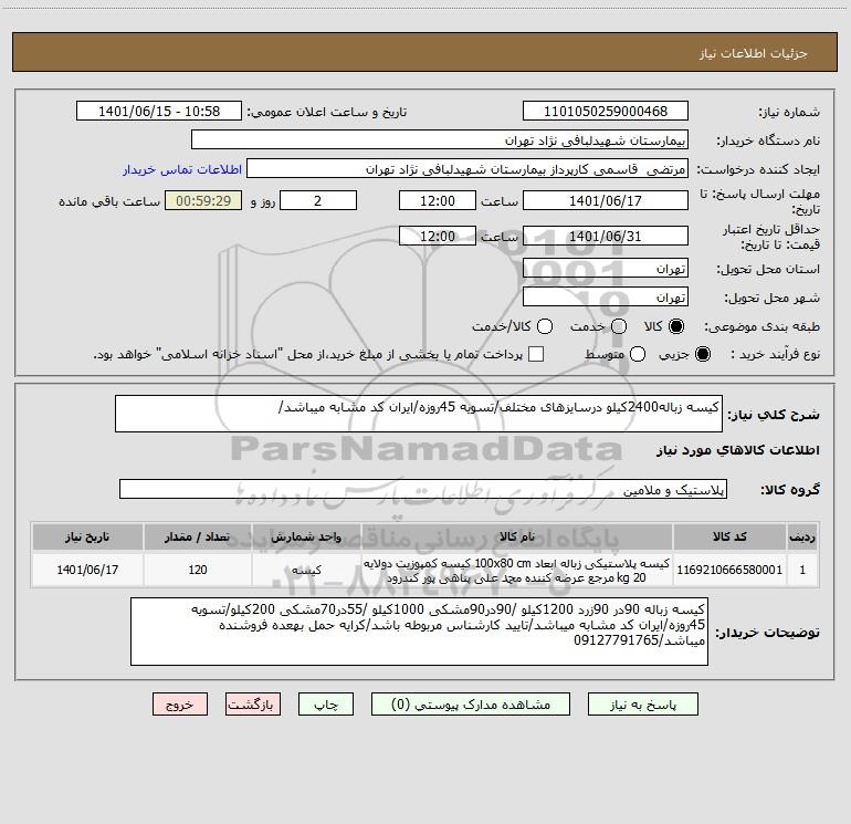 شرح کلی نیاز: کیسه زباله2400کیلو درسایزهای مختلف/تسویه 45روزه/ایران کد مشابه میباشد/