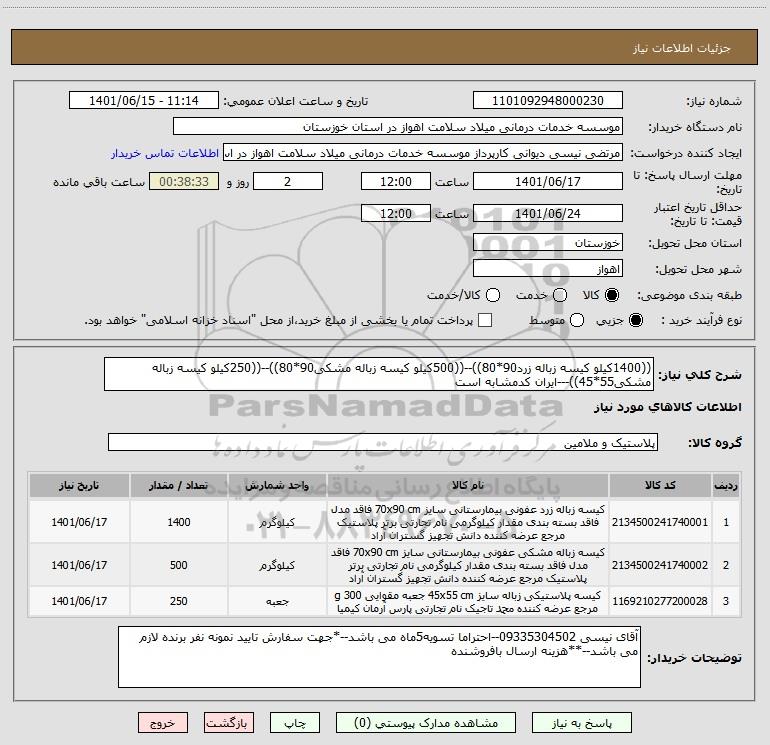 شرح کلی نیاز: ((1400کیلو کیسه زباله زرد90*80))--((500کیلو کیسه زباله مشکی90*80))--((250کیلو کیسه زباله مشکی55*45))---ایران کدمشابه است