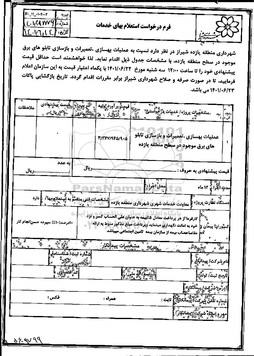 شهرداری منطقه یازده شیراز در نظر دارد نسبت به عملیات بهسازی، تعمیرات و بازسازی تابلوهای برق موجود در سطح منطقه یازده، با مشخصات جدول ذیل اقدام نماید. لذا خواهشمند است حداقل قیمت پیشنهادی خود را تا ساعت 12 پنج شنبه تاریخ 1401.6.22 با یک ماه اعتبار قیمت به این سازمان اعلام فرمایید تا در صورت صرفه و صلاح شهرداری شیراز برابر مقررات اقدام گردد. تاریخ بازگشایی پاکات 1401.6.23 می باشد.