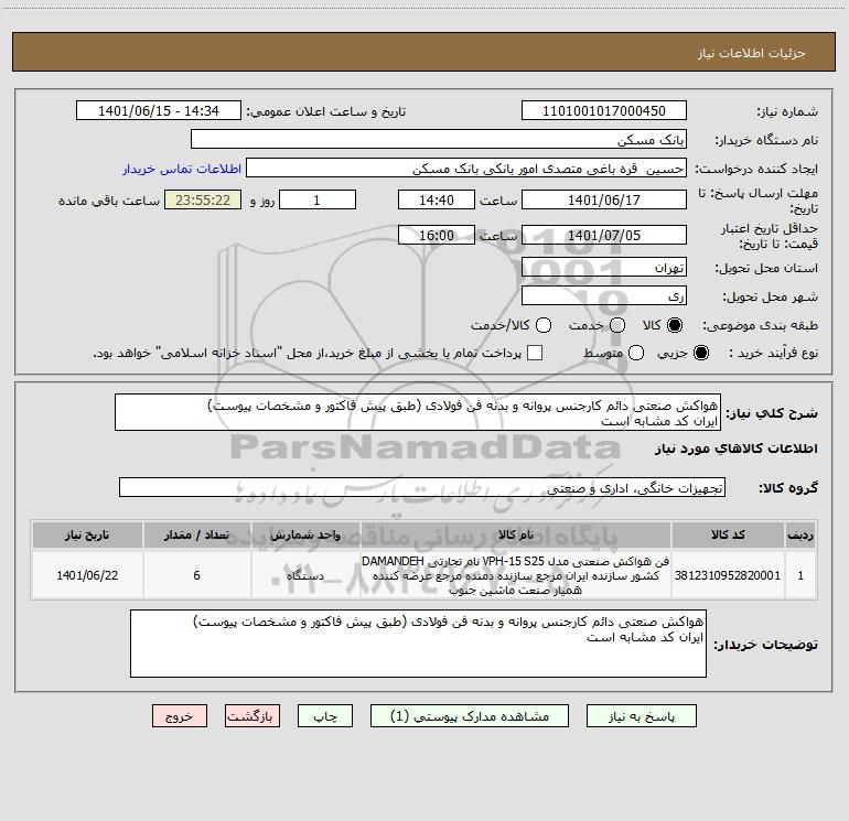 توضیحات خریدار:هواکش صنعتی دائم کارجنس پروانه و بدنه فن فولادی (طبق پیش فاکتور و مشخصات پیوست) ایران کد مشابه است