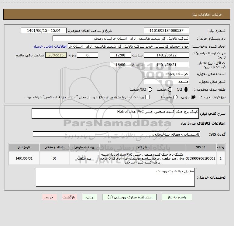 نام دستگاه خریدار:شرکت پالایش گاز شهید هاشمی نژاد استان خراسان رضوی