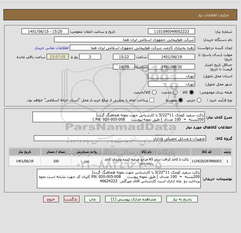 شرح کلی نیاز: پاکت سفید کوچک 11*5/22 با کارشناس جهت نمونه هماهنگ گردد( 200بسته = 100 عددی ) طبق نمونه پیوست PN: 920-005-008 )