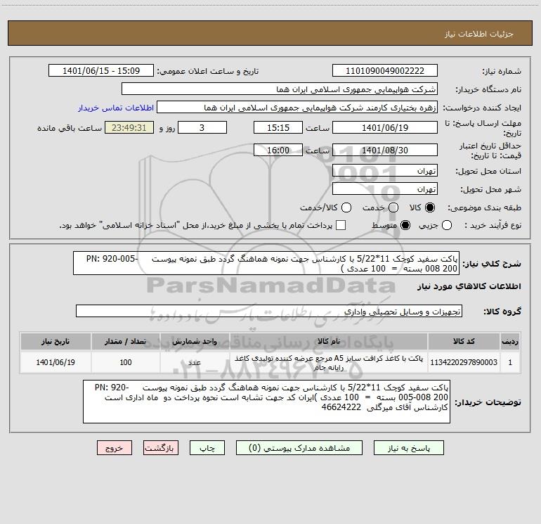 شرح کلی نیاز: پاکت سفید کوچک 11*5/22 با کارشناس جهت نمونه هماهنگ گردد طبق نمونه پیوست PN: 920-005-008 200 بسته = 100 عددی )