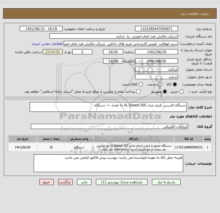 شرح کلی نیاز: دستگاه اکسس کنترل مدل VL Speed-355 به تعداد ۱۰ دستگاه