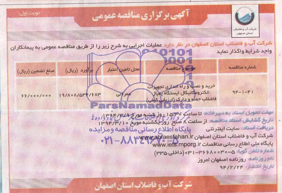 | 94-1-41 | خرید و نصب و راه اندازی تجهیزات الکترومکانیکال ایستگاه پمپاژ فاضلاب حصه و دارک (ارزیابی کیفی) |
