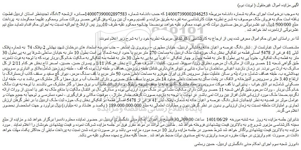 به موجب درخواست اجرای حکم به شماره دادنامه مربوطه 140007390002046253 که حسب دادنامه شماره 140007390002897583صادره ازشعبه 7دادگاه تجدیدنظر استان اردبیل قطعیت یافته است حکم به فروش ملک موصوف به شرح نظریه هیئت کارشناسی سه نفره به طریق مزایده و تقسیم وجوه آن بین ورثه وفق گواهی حصر وراثت صادر ومحکوم علیهما محکومند به  پرداخت مبلغ 1/500/000ریال نیم عشردولتی درحق صندوق دولت که برعهده محکوم علیه خواهد بودضمنا چنانچه محکوم علیه ظرف 10روز پس ازابلاغ اجرائیه نسبت به اجرای حکم اقدام ننماید مبلغ نیم عشردولتی ازنامبرده اخذ خواهد شد .