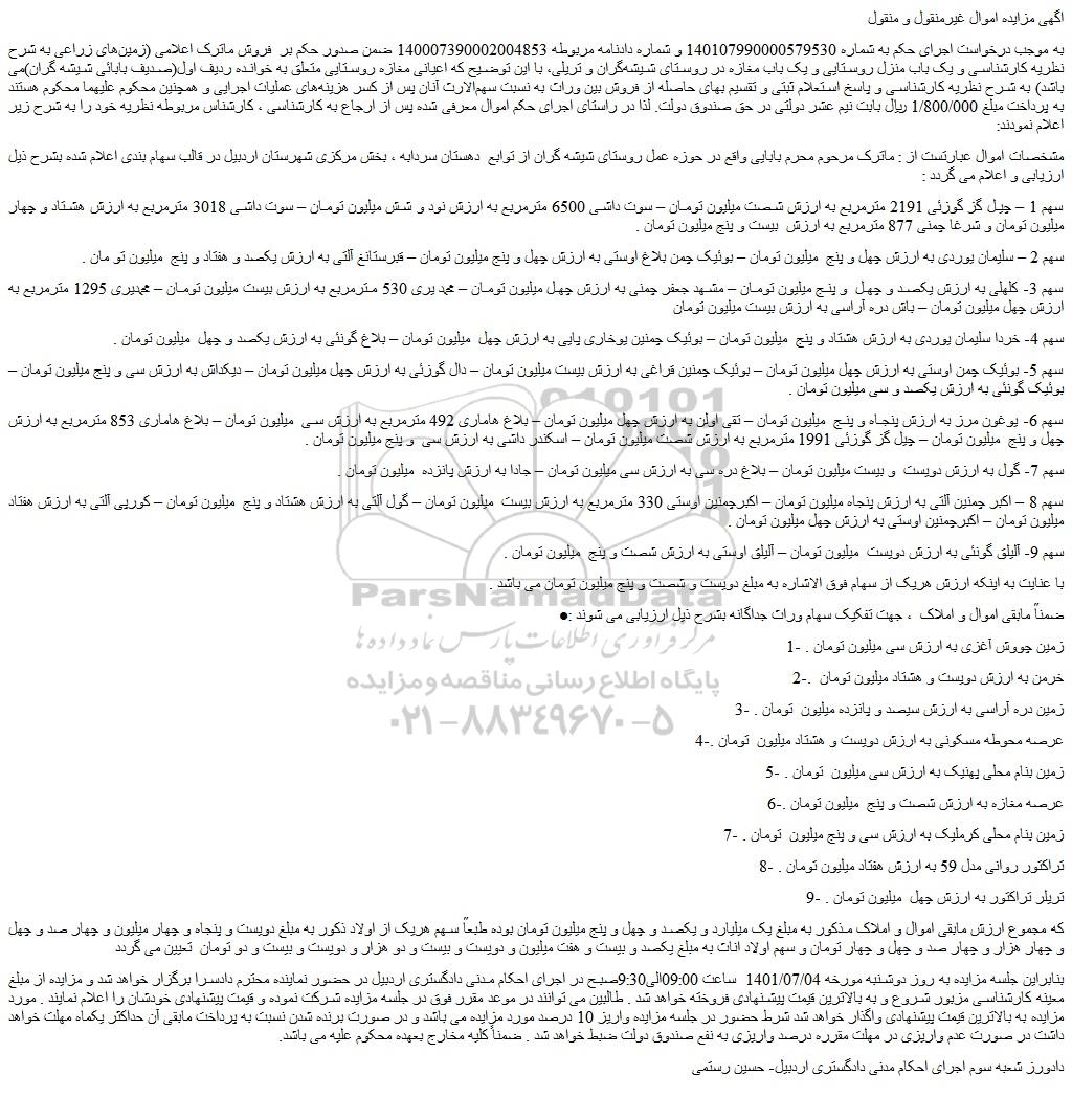 مشخصات اموال عبارتست از : ماترک مرحوم محرم بابایی واقع در حوزه عمل روستای شیشه گران از توابع دهستان سردابه ، بخش مرکزی شهرستان اردبیل در قالب سهام بندی اعلام شده بشرح ذیل ارزیابی و اعلام می گردد :