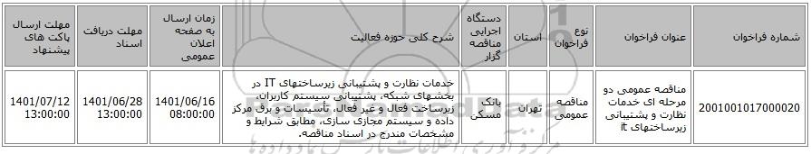 2001001017000020 | مناقصه عمومی دو مرحله ای خدمات نظارت و پشتیبانی زیرساختهای it | مناقصه عمومی | تهران | بانک مسکن | خدمات نظارت و پشتیبانی زیرساختهای IT در بخشهای شبکه، پشتیبانی سیستم کاربران، زیرساخت فعال و غیر فعال، تأسیسات و برق مرکز داده و سیستم مجازی سازی، مطابق شرایط و مشخصات مندرج در اسناد مناقصه. | 1401/06/16 08:00:00 | 1401/06/28 13:00:00 | 1401/07/12 13:00:00 |