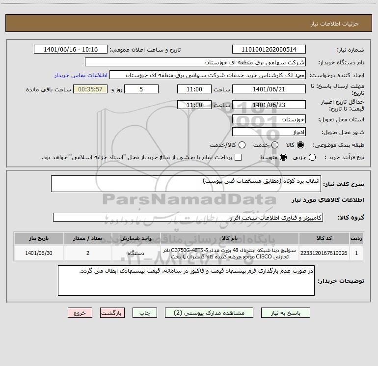 شرح کلی نیاز: انتقال برد کوتاه (مطابق مشخصات فنی پیوست)