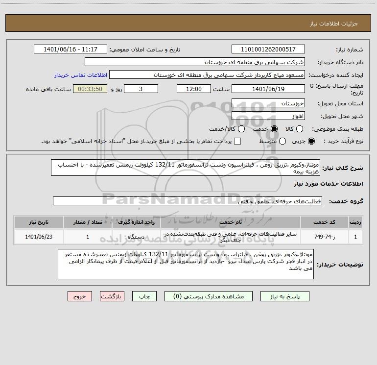 شرح کلی نیاز: مونتاژ،وکیوم ،تزریق روغن ، فیلتراسیون وتست ترانسفورماتور 132/11 کیلوولت زیمنس تعمیرشده - با احتساب هزینه بیمه