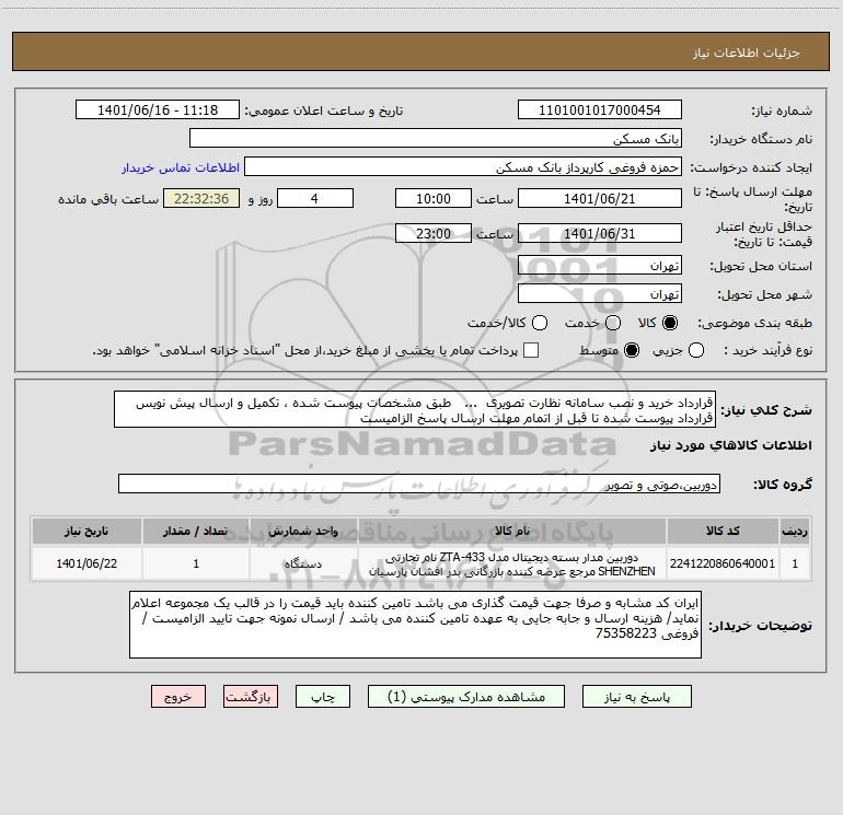 شرح کلی نیاز: قرارداد خرید و نصب سامانه نظارت تصویری ... طبق مشخصات پیوست شده ، تکمیل و ارسال پیش نویس قرارداد پیوست شده تا قبل از اتمام مهلت ارسال پاسخ الزامیست