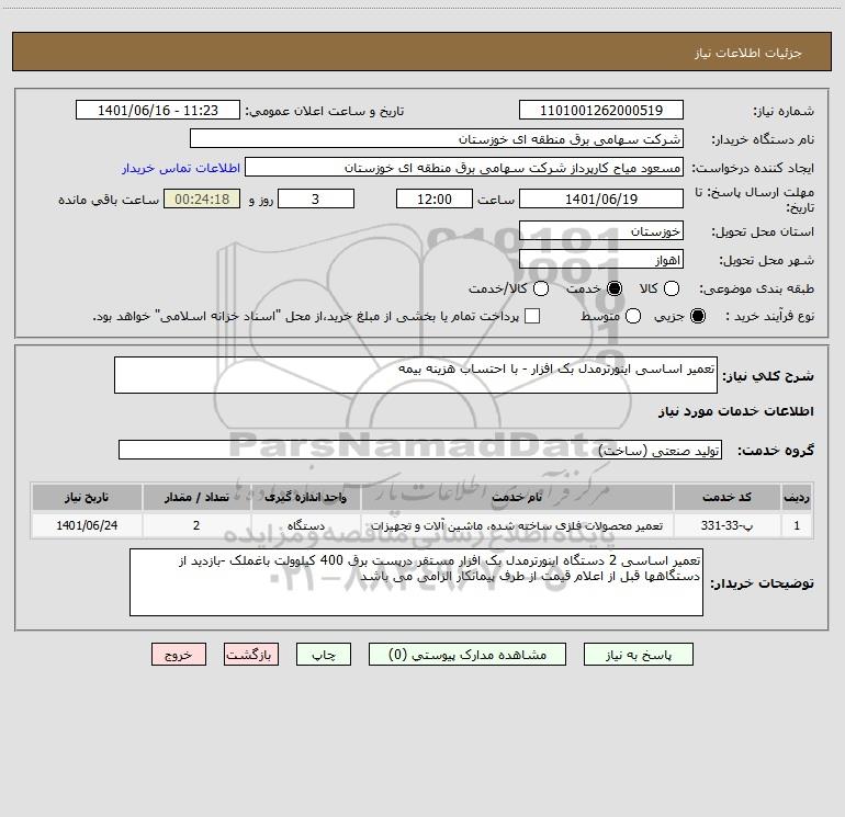 توضیحات خریدار:تعمیر اساسی 2 دستگاه اینورترمدل بک افزار مستقر درپست برق 400 کیلوولت باغملک -بازدید از دستگاهها قبل از اعلام قیمت از طرف پیمانکار الزامی می باشد