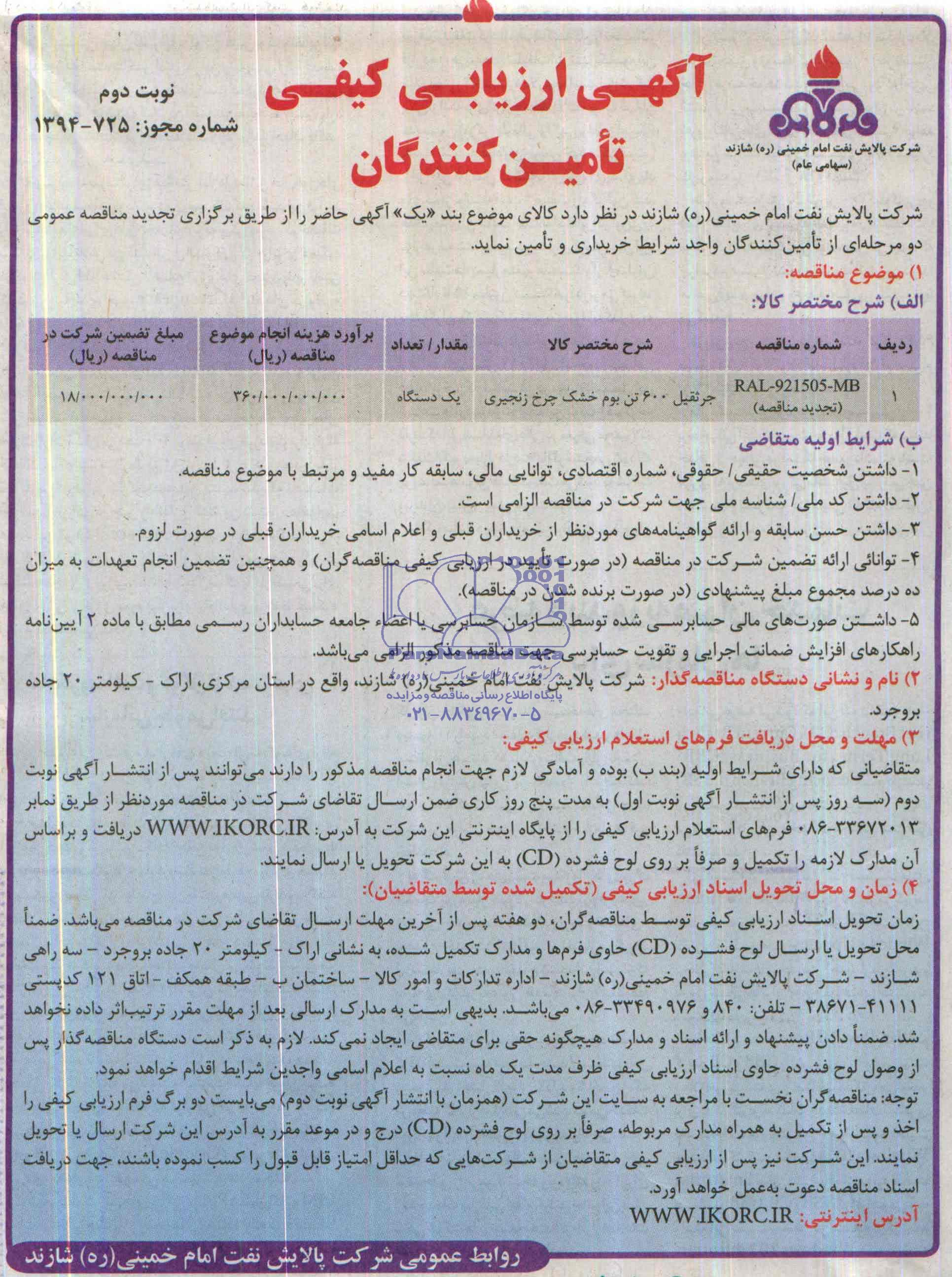 شرکت پالایش نفت امام خمینی ره شازند در نظر دارد کالای موضوع بند یک آگهی حاضر را از طریق برگزاری مناقصه عمومی دو مرحله ای ازتامین کننده واجد شرایط خریداری و تامین نماید.