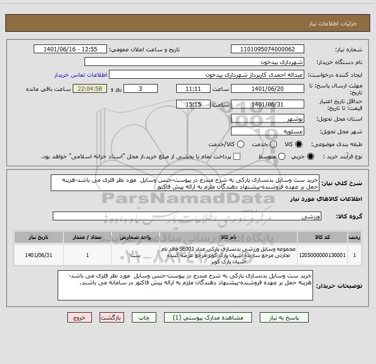 استعلام بها و موضوع استعلام استعلام خرید ست وسایل بدنسازی پارکی به شرح مندرج در پیوست-جنس وسایل مورد نظر فلزی می باشد-هزینه حمل بر عهده فروشنده-پیشنهاد دهندگان ملزم به ارائه پیش فاکتور به اطلاع کلیه شرکت‌ها و افراد متخصص واجد شرایط می‌رساند، آگهی گذار در نظر دارد از طریق استعلام بها، نسبت به انتخاب و دریافت پیشنهادات اقدام نماید. این استعلام با کد آگهی ثبت شده در سامانه خبرگزاری پارس نماد : 4912662 منتشر شده است. مشخصات استعلام : تاریخ شروع استعلام: 1401/06/16 آخرین مهلت ارسال پیشنهاد قیمت : 1401/06/20 و محل اجرای پروژه : استان بوشهر میباشد. استعلام قیمت مورد درخواست : استعلام خرید ست وسایل بدنسازی پارکی به شرح مندرج در پیوست-جنس وسایل مورد نظر فلزی می باشد-هزینه حمل بر عهده فروشنده-پیشنهاد دهندگان ملزم به ارائه پیش فاکتور با دسته‌بندی‌های تخصصی و گروه های مرتبط : تجهیزات پارک و مبلمان شهری, تجهیزات ورزشی, استعلام اطلاع رسانی میگردد. شرایط شرکت در استعلام آنلاین : ابتدا ثبت نام در سامانه استعلام پارس نماد و تکمیل مدارک موردنیاز و بارگذاری در سامانه رعایت تمامی ضوابط و الزامات مندرج در اسناد استعلام است.
