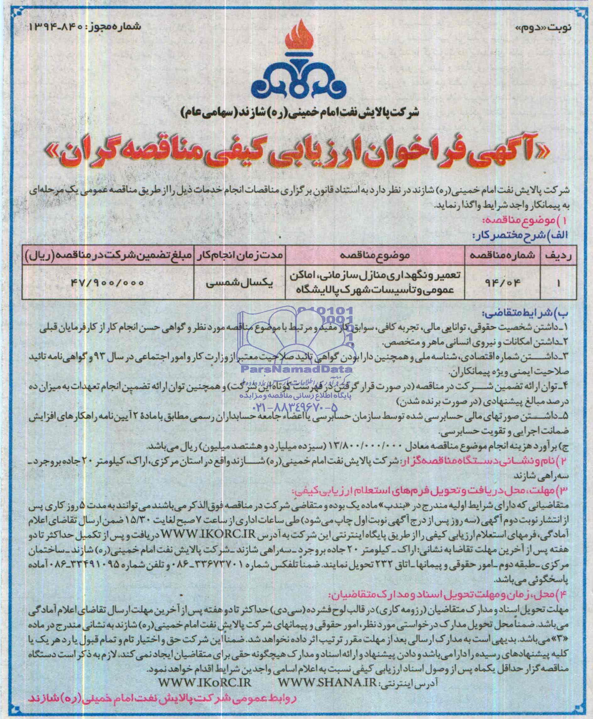 | 1 | 94/04 | تعمیر و نگهداری منازل سازمانی , اماکن عمومی و تاسیسات شهرک پالایشگاه |