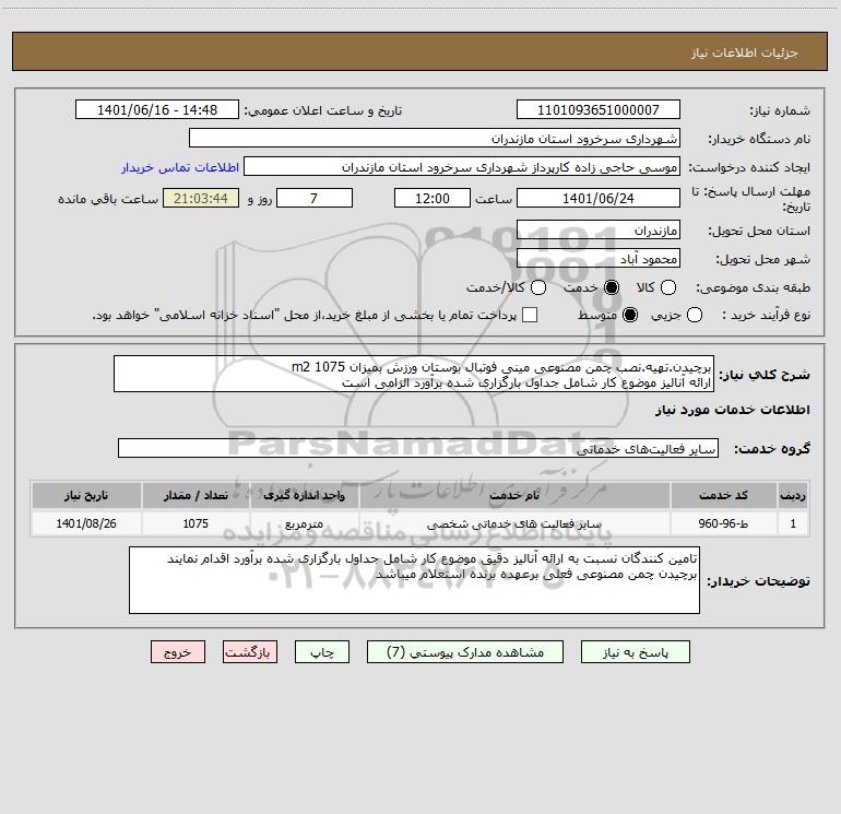 شرح کلی نیاز: برچیدن.تهیه.نصب چمن مصنوعی مینی فوتبال بوستان ورزش بمیزان 1075 m2
