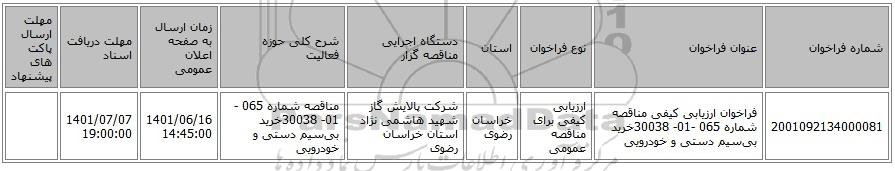 | 2001092134000081 | فراخوان ارزیابی کیفی مناقصه شماره 065 -01- 30038خرید بیسیم دستی و خودرویی | ارزیابی کیفی برای مناقصه عمومی | خراسان رضوی | شرکت پالایش گاز شهید هاشمی نژاد استان خراسان رضوی | مناقصه شماره 065 -01- 30038خرید بیسیم دستی و خودرویی | 1401/06/16 14:45:00 | 1401/07/07 19:00:00 |