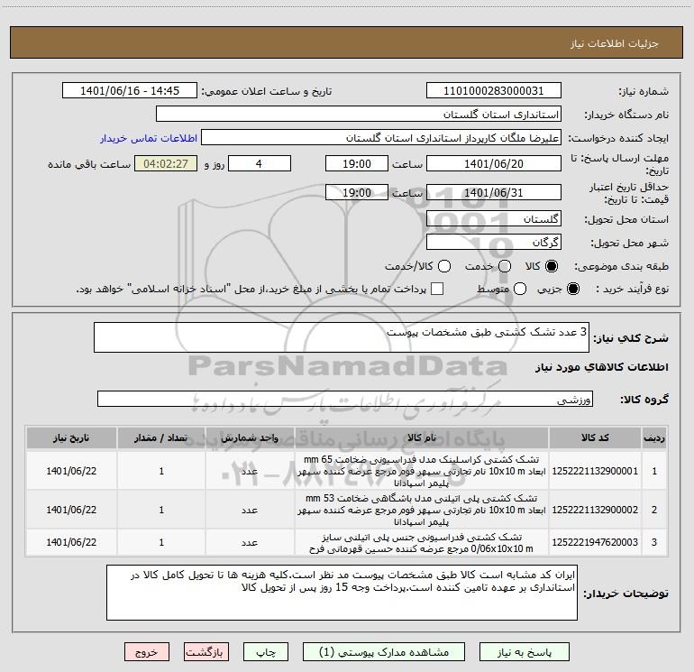 شرح کلی نیاز: 3 عدد تشک کشتی طبق مشخصات پیوست