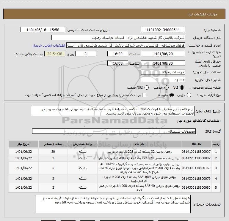نام دستگاه خریدار:شرکت پالایش گاز شهید هاشمی نژاد استان خراسان رضوی