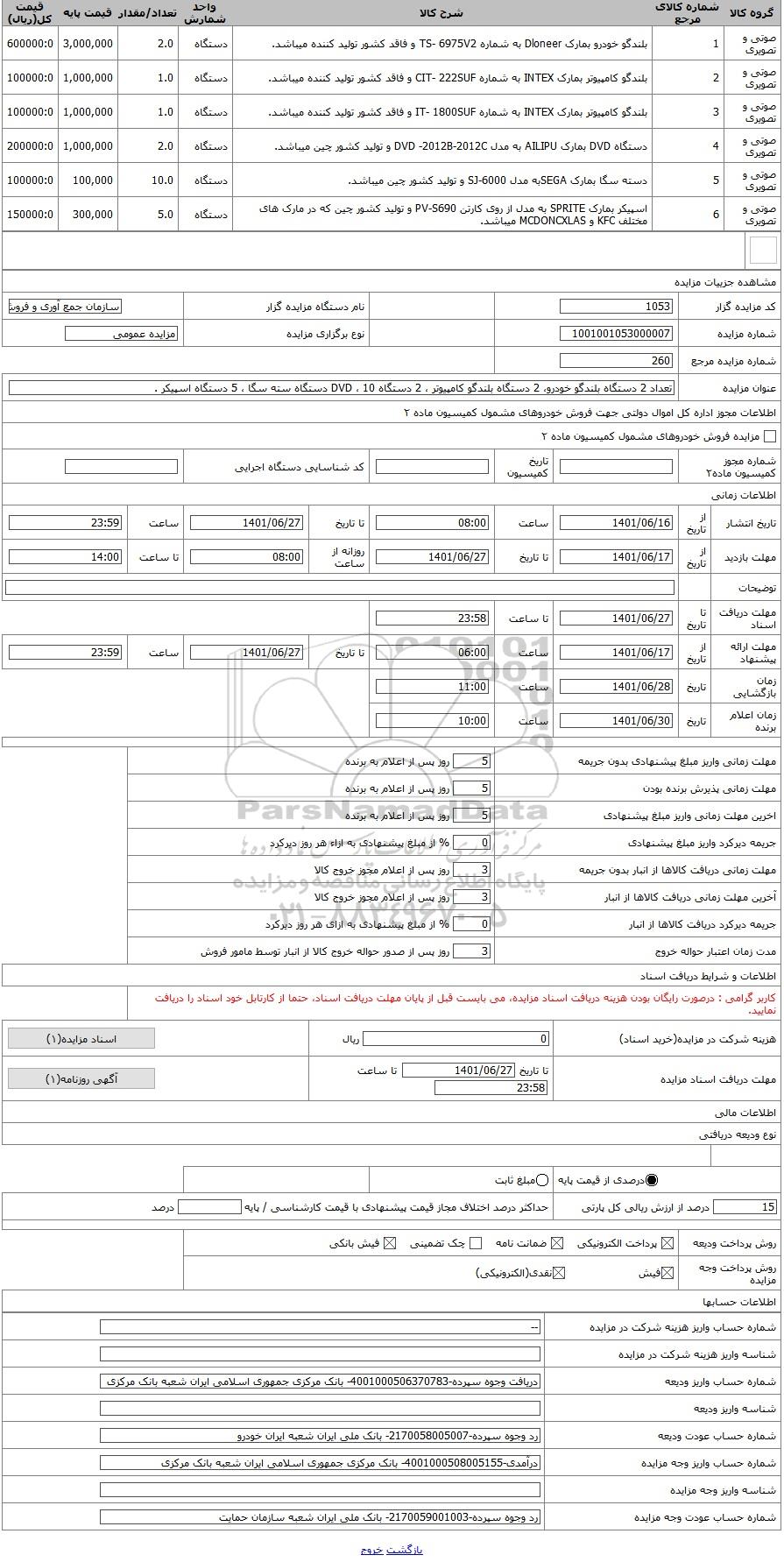 | کد مزایده گزار | 1053 | نام دستگاه مزایده گزار | سازمان جمع آوری و فروش اموال تملیکی | |