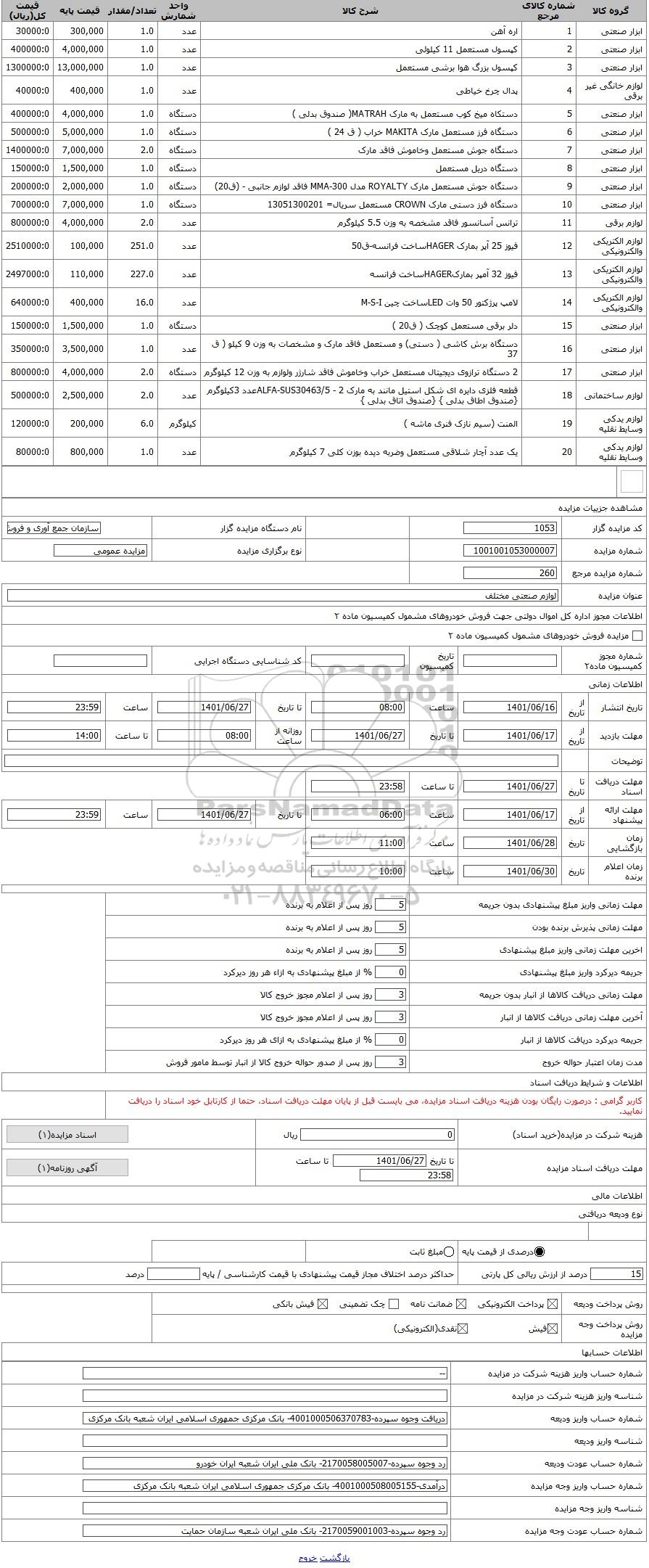 | کد مزایده گزار | 1053 | نام دستگاه مزایده گزار | سازمان جمع آوری و فروش اموال تملیکی | |