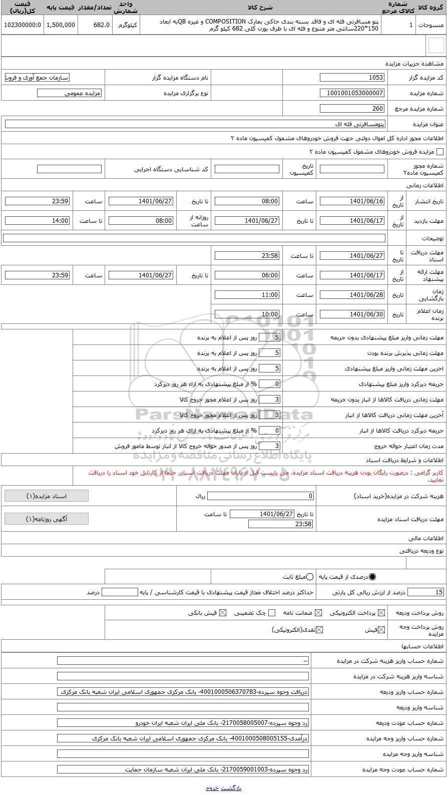 | شماره پارتی | 1101001053006412 | نوع برگزاری مزایده | مزایده عمومی | |
