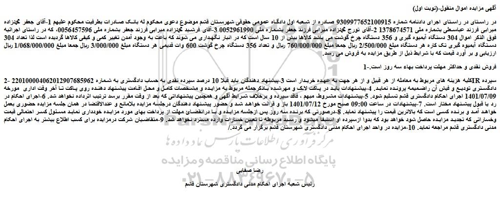 در راستای در راستای اجرای دادنامه شماره 9309977652100915 صادره از شعبه اول دادگاه عمومی حقوقی شهرستان قشم موضوع دعوی محکوم له بانک صادرات بطرفیت محکوم علیهم 1-آقای جعفر محمدزاده میرابی فرزند عباسعلی بشماره ملی 1378674571 2-آقای تورج محمدزاده میرابی فرزند جعفر بشماره ملی 0052961990 3-آقای فرشید محمدزاده میرابی فرزند جعفر بشماره ملی 0056457596، که در راستای اجرائیه فوق الذکر اموال 304 دستگاه آبمیوه گیری و 356 دستگاه چرخ گوشت می باشد کالاها بیش از 10 سال است که در انبار نگهداری می شوند که باعث به وجود آمدن تغییر کمی و کیفی کالاها گردیده است لذا تعداد 304 دستگاه آبمیوه گیری تک کاره هر دستگاه مبلغ 2/500/000 ریال جمعا مبلغ 760/000/000 ریال و تعداد 356 دستگاه چرخ گوشت 600 وات قدیمی هر دستگاه مبلغ 3/000/000 ریال جمعا مبلغ 1/068/000/000 ریال ارزیابی و بر آورد قیمت که با شرایط ذیل از طریق مزایده به فروش می رسد.