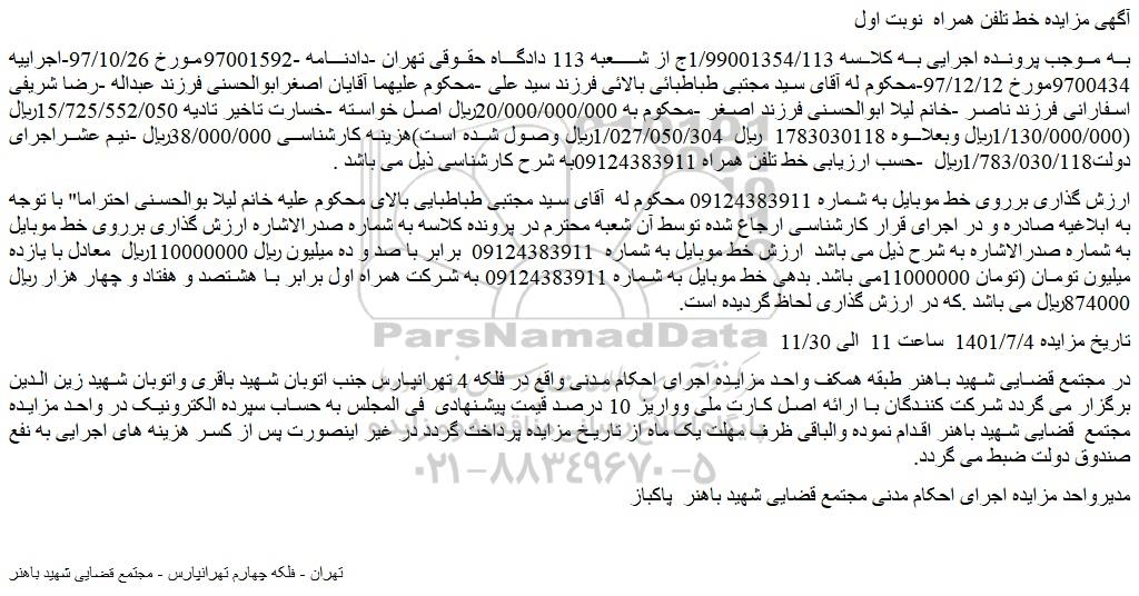 به موجب پرونده اجرایی به کلاسه 1/99001354/113ج از شعبه 113 دادگاه حقوقی تهران -دادنامه -97001592مورخ 97/10/26-اجراییه 9700434مورخ 97/12/12-محکوم له آقای سید مجتبی طباطبائی بالائی فرزند سید علی -محکوم علیهما آقایان اصغرابوالحسنی فرزند عبداله -رضا شریفی اسفارانی فرزند ناصر -خانم لیلا ابوالحسنی فرزند اصغر -محکوم به 20/000/000/000ریال اصل خواسته -خسارت تاخیر تادیه 15/725/552/050ریال (1/130/000/000ریال وبعلاوه 1783030118ریال  1/027/050/304ریال وصول شده است)هزینه کارشناسی 38/000/000ریال -نیم عشراجرای دولت1/783/030/118ریال  -حسب ارزیابی خط تلفن همراه 09124383911به شرح کارشناسی ذیل می باشد .