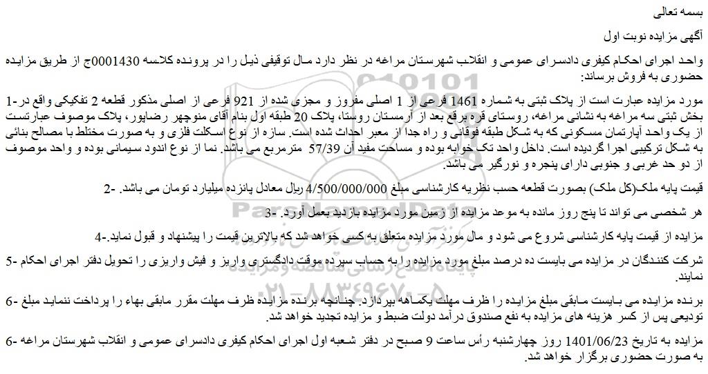 6- مزایده به تاریخ 1401/06/23 روز چهارشنبه رأس ساعت 9 صبح در دفتر شعبه اول اجرای احکام کیفری دادسرای عمومی و انقلاب شهرستان مراغه به صورت حضوری برگزار خواهد شد.