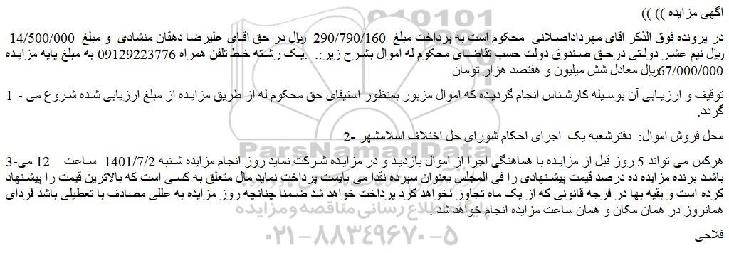 در پرونده فوق الذکر آقای مهرداداصلانی  محکوم است به پرداخت مبلغ  290/790/160  ریال در حق آقای علیرضا دهقان منشادی  و مبلغ  14/500/000  ریال نیم عشر دولتی درحق صندوق دولت حسب تقاضای محکوم له اموال بشرح زیر:.  .یک رشته خط تلفن همراه 09129223776 به مبلغ پایه مزایده 67/000/000ریال معادل شش میلیون و هفتصد هزار تومان