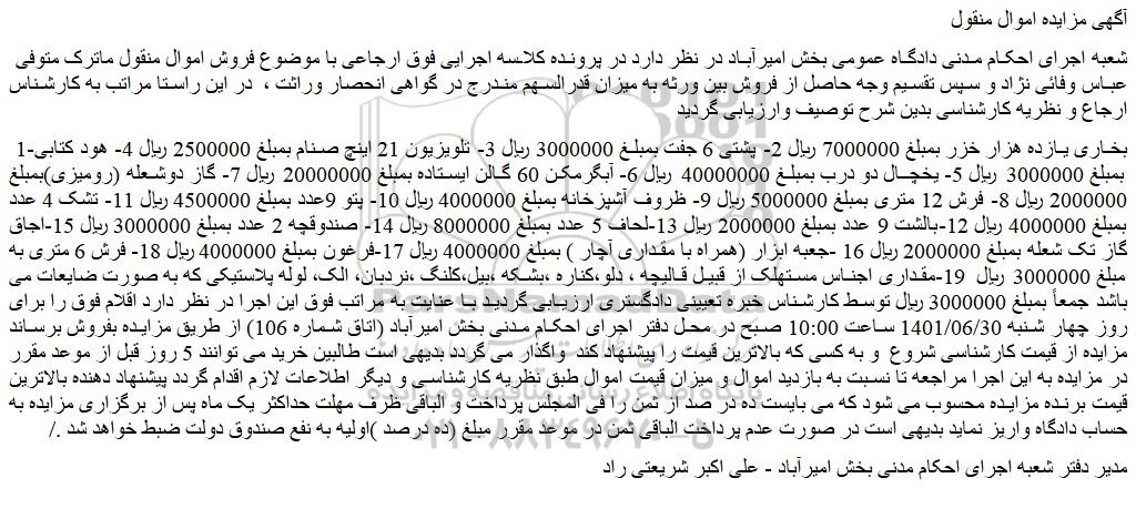 1-بخاری یازده هزار خزر بمبلغ 7000000 ریال 2- پشتی 6 جفت بمبلغ 3000000 ریال 3- تلویزیون 21 اینچ صنام بمبلغ 2500000 ریال 4- هود کتابی بمبلغ 3000000 ریال 5- یخچال دو درب بمبلغ 40000000 ریال 6- آبگرمکن 60 گالن ایستاده بمبلغ 20000000 ریال 7- گاز دوشعله (رومیزی)بمبلغ 2000000 ریال 8- فرش 12 متری بمبلغ 5000000 ریال 9- ظروف آشپزخانه بمبلغ 4000000 ریال 10- پتو 9عدد بمبلغ 4500000 ریال 11- تشک 4 عدد بمبلغ 4000000 ریال 12-بالشت 9 عدد بمبلغ 2000000 ریال 13-لحاف 5 عدد بمبلغ 8000000 ریال 14- صندوقچه 2 عدد بمبلغ 3000000 ریال 15-اجاق گاز تک شعله بمبلغ 2000000 ریال 16 -جعبه ابزار (همراه با مقداری آچار ) بمبلغ 4000000 ریال 17-فرغون بمبلغ 4000000 ریال 18- فرش 6 متری به مبلغ 3000000 ریال  19-مقداری اجناس مستهلک از قبیل قالیچه ، دلو،کناره ،بشکه ،بیل،کلنگ ،نردبان، الک، لوله پلاستیکی که به صورت ضایعات می باشد جمعاً بمبلغ 3000000 ریال توسط کارشناس خبره تعیینی دادگستری ارزیابی گردید با عنایت به مراتب فوق این اجرا در نظر دارد اقلام فوق را برای روز چهار شنبه 1401/06/30 ساعت 10:00 صبح در محل دفتر اجرای احکام مدنی بخش امیرآباد (اتاق شماره 106) از طریق مزایده بفروش برساند مزایده از قیمت کارشناسی شروع  و به کسی که بالاترین قیمت را پیشنهاد کند  واگذار می گردد بدیهی است طالبین خرید می توانند 5 روز قبل از موعد مقرر در مزایده به این اجرا مراجعه تا نسبت به بازدید اموال و میزان قیمت اموال طبق نظریه کارشناسی و دیگر اطلاعات لازم اقدام گردد پیشنهاد دهنده بالاترین قیمت برنده مزایده محسوب می شود که می بایست ده در صد از ثمن را فی المجلس پرداخت و الباقی ظرف مهلت حداکثر یک ماه پس از برگزاری مزایده به حساب دادگاه واریز نماید بدیهی است در صورت عدم پرداخت الباقی ثمن در موعد مقرر مبلغ (ده درصد )اولیه به نفع صندوق دولت ضبط خواهد شد ./