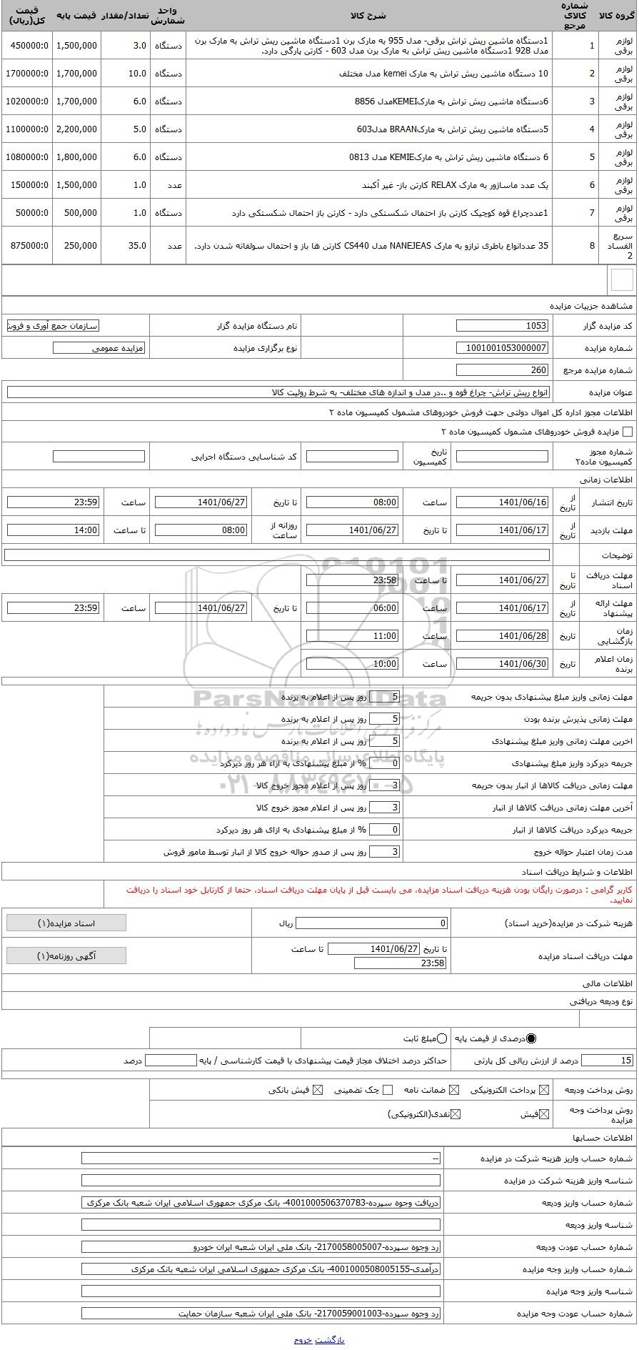 | کد مزایده گزار | 1053 | نام دستگاه مزایده گزار | سازمان جمع آوری و فروش اموال تملیکی | |
