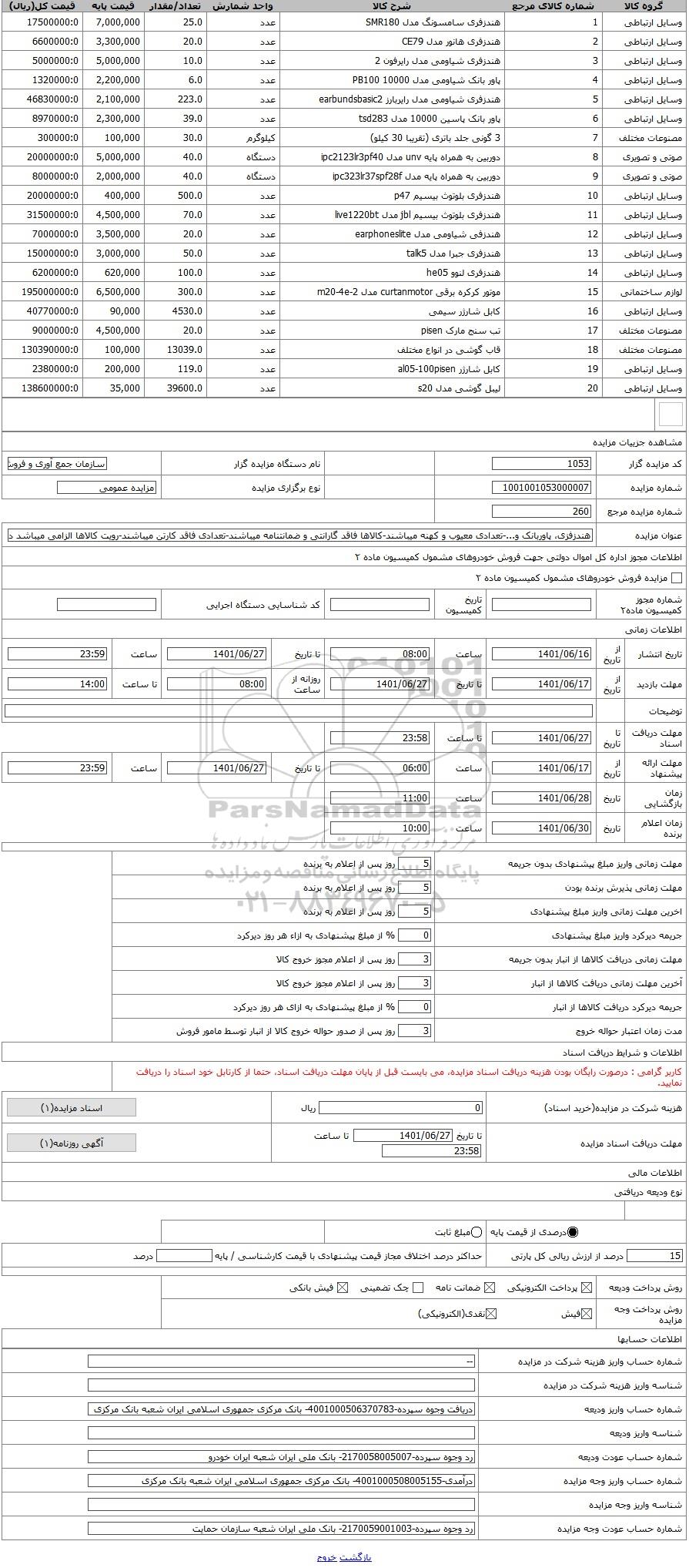 مزایده عمومی مزایده ، هندزفزی، پاوربانک و...-تعدادی معیوب و کهنه میباشند-کالاها فاقد گارانتی و ضمانتنامه میباشند-تعدادی فاقد کارتن میباشند-رو برگزار میگردد. از کلیه افراد متخصص و شرکت‌های واجد شرایط دعوت به عمل می‌آید تا در این مزایده با کد خبرگزاری پارس نماد : 4915443 شرکت نمایند تاریخ شروع مزایده : 1401/06/16 مهلت شرکت در مزایده: تا پایان روز 1401/06/27 مکان برگزاری اموال واگذاری استان‌های قم و دسته‌بندی‌های مربوط به این حراجی سیم و کابل, مخابرات, متفرقه میباشد.