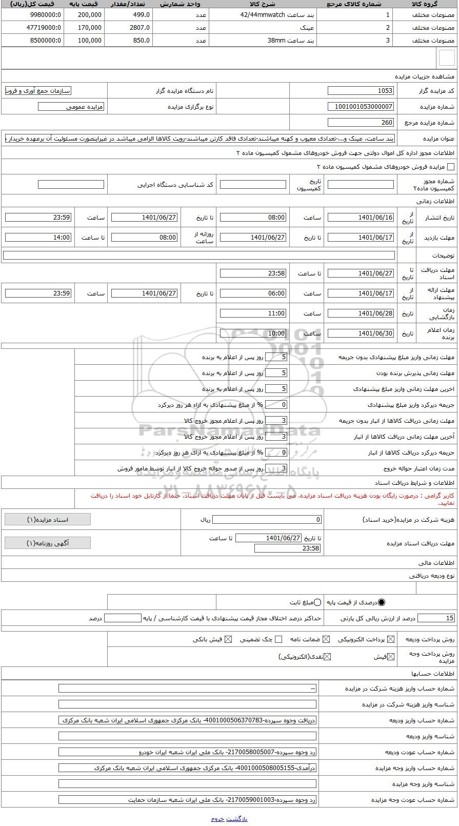 مزایده عمومی مزایده ، بند ساعت، عینک و...-تعدادی معیوب و کهنه میباشند-تعدادی فاقد کارتن میباشند-رویت کالاها الزامی میباشد در غیراینصورت مسئول برگزار میگردد. از کلیه افراد متخصص و شرکت‌های واجد شرایط دعوت به عمل می‌آید تا در این مزایده با کد خبرگزاری پارس نماد : 4915447 شرکت نمایند تاریخ شروع مزایده : 1401/06/16 مهلت شرکت در مزایده: تا پایان روز 1401/06/27 مکان برگزاری اموال واگذاری استان‌های قم و دسته‌بندی‌های مربوط به این حراجی متفرقه میباشد.