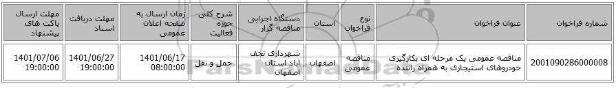 | 2001090286000008 | مناقصه عمومی یک مرحله ای بکارگیری خودروهای استیجاری به همراه راننده | مناقصه عمومی | اصفهان | شهرداری نجف اباد استان اصفهان | حمل و نقل | 1401/06/17 08:00:00 | 1401/06/27 19:00:00 | 1401/07/06 19:00:00 |